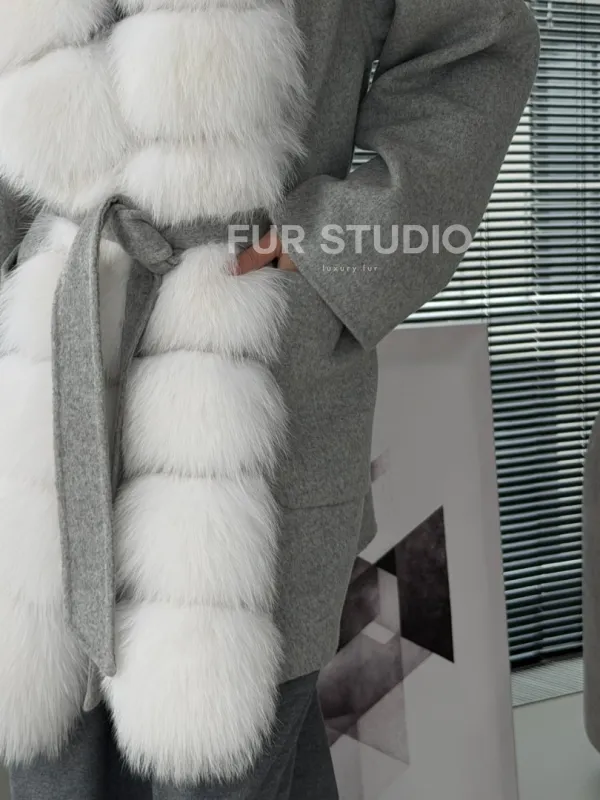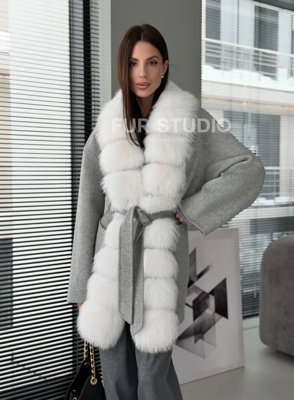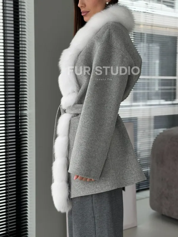 Серое пальто с меховым воротником 102909